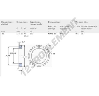 Cet écrou KMFE17-SKF possède un diamètre intérieur de 85mm, un diamètre extérieur de 110mm et une épaisseur de 19mm.