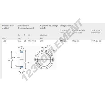 Cet écrou KML26-SKF possède un diamètre intérieur de 130mm, un diamètre extérieur de 155mm et une épaisseur de 21mm.