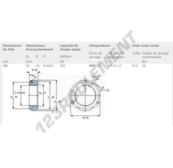 Cet écrou KMT12-SKF possède un diamètre intérieur de 60mm, un diamètre extérieur de 82mm et une épaisseur de 26mm.