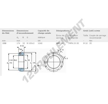 Cet écrou KMT30-SKF possède un diamètre intérieur de 150mm, un diamètre extérieur de 174mm et une épaisseur de 32mm.