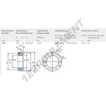 Cet écrou KMT40-SKF possède un diamètre intérieur de 200mm, un diamètre extérieur de 224mm et une épaisseur de 32mm.