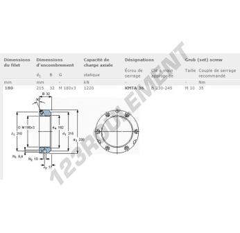 Cet écrou KMTA36-SKF possède un diamètre intérieur de 180mm, un diamètre extérieur de 215mm et une épaisseur de 32mm.