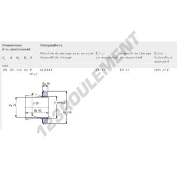 Le Manchon, connu sous la référence H2317-SKF SKF, possède un diamètre intérieur de 75 mm, un diamètre extérieur de 110 mm et une épaisseur de 82 mm.