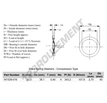 La Rondelle Ondulée - Type Compression de référence WSW-CT-39.100-33-0.400-4 possède un diamètre intérieur de 33 mm, un diamètre extérieur de 39.1 mm et une épaisseur de 0.4 mm. Elle est fabriquée en matière ACIER.