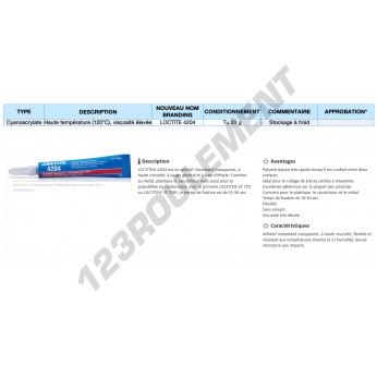 La 4204-20G-LOCTITE est une colle cyanoacrylate à viscosité moyenne, conçue pour des applications sur des surfaces irrégulières où une adhérence rapide est nécessaire. Elle offre une bonne résistance aux températures modérées et une prise rapide sur une large gamme de matériaux.