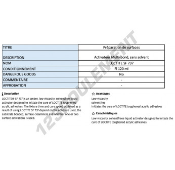 Le Loctite SF 737 120ML est un activateur à séchage rapide de 120ML, conçu pour optimiser la polymérisation des adhésifs Loctite dans des applications nécessitant des performances rapides et efficaces.