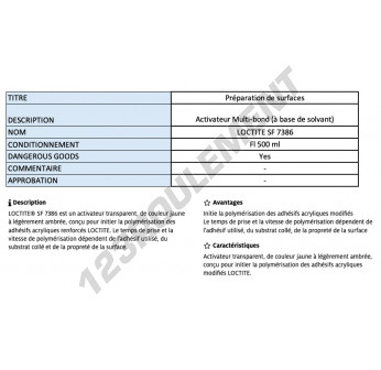 Le Loctite SF 7386 500ML est un activateur professionnel de 500ML, conçu pour accélérer la polymérisation des adhésifs Loctite, même dans des environnements industriels difficiles.