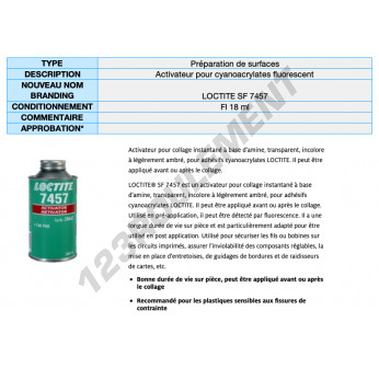 Le Loctite SF 7457 18ML est un activateur en petite quantité de 18ML, conçu pour améliorer l'adhésion et la durabilité des adhésifs Loctite. Idéal pour des applications de précision ou pour des projets nécessitant des petites doses d'activateur.