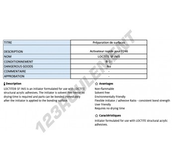 Le Loctite SF INI5 1L est un activateur à haute capacité de 1L, conçu pour optimiser la polymérisation des adhésifs Loctite dans des environnements industriels exigeants, offrant une prise rapide et une performance optimale.