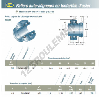 L'Accessoire De Palier connu sous la référence EX305-14-G2-SNR SNR possède un diamètre intérieur de 22.225 mm, un diamètre extérieur de 62 mm et une épaisseur de 21 mm. Il est fabriqué en .