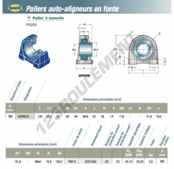 Le Palier - 2 Fixations connu sous la référence UCPA210-SNR SNR possède un diamètre d'alésage de 50 mm et un entraxe de fixation de 94 mm. Cette référence est fabriquée en fonte et le type de serrage se fait par vis de blocage.