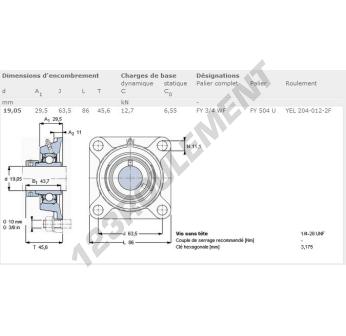 Le Palier - 4 Fixations connu sous la référence FY3-4-WF-SKF de la marque SKF possède un diamètre d'alésage de 19.05 mm et un entraxe de fixation de 63.5 mm. Cette référence est fabriquée en fonte et le type de serrage se fait par Bague de blocage excentrique.
