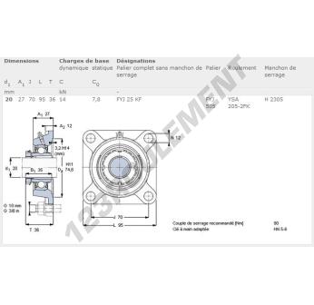 Le Palier - 4 Fixations connu sous la référence FYJ25-KF-SKF de la marque SKF possède un diamètre d'alésage de 20 mm et un entraxe de fixation de 70 mm. Cette référence est fabriquée en fonte et le type de serrage se fait par Manchon de serrage.