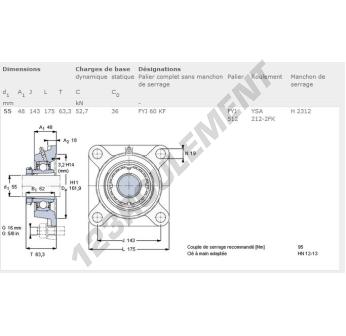 Le Palier - 4 Fixations connu sous la référence FYJ60-KF-SKF de la marque SKF possède un diamètre d'alésage de 55 mm et un entraxe de fixation de 143 mm. Cette référence est fabriquée en fonte et le type de serrage se fait par Manchon de serrage.