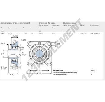 Le Palier - 4 Fixations connu sous la référence FYJ70-TF-SKF de la marque SKF possède un diamètre d'alésage de 70 mm et un entraxe de fixation de 152 mm. Cette référence est fabriquée en fonte et le type de serrage se fait par vis de blocage.