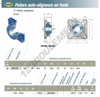 Le Palier - 4 Fixations connu sous la référence UKF218H-SNR de la marque SNR possède un diamètre d'alésage de 80 mm et un entraxe de fixation de 187 mm. Cette référence est fabriquée en fonte et le type de serrage se fait par Manchon de serrage.