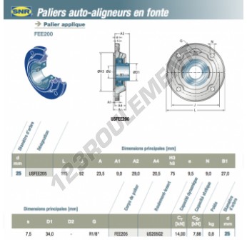 Le Palier - 4 Fixations connu sous la référence USFEE205-SNR de la marque SNR possède un diamètre d'alésage de 25 mm et un entraxe de fixation de 92 mm. Cette référence est fabriquée en fonte et le type de serrage se fait par vis de blocage.