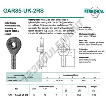 La Rotule Ge connue sous la référence GAR35-UK-2RS-DURBAL, de la marque DURBAL possède un diamètre intérieur de 35mm, un diamètre extérieur de 82mm et une épaisseur de 25mm.