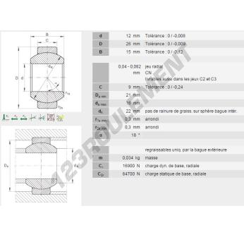 La Rotule Ge connue sous la référence GE12-FO-INA, de la marque INA possède un diamètre intérieur de 12mm, un diamètre extérieur de 26mm et une épaisseur de 15mm.