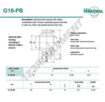 La Rotule Geew connue sous la référence G18-PB-DURBAL, de la marque DURBAL possède un diamètre intérieur de 18mm, un diamètre extérieur de 35mm et une épaisseur de 16.5mm.