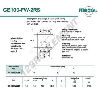 La Rotule Geew connue sous la référence GE100-FW-2RS-DURBAL, de la marque DURBAL possède un diamètre intérieur de 100mm, un diamètre extérieur de 160mm et une épaisseur de 55mm.