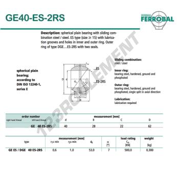 La Rotule Geew connue sous la référence GE40-ES-2RS-DURBAL, de la marque DURBAL possède un diamètre intérieur de 40mm, un diamètre extérieur de 62mm et une épaisseur de 22mm.