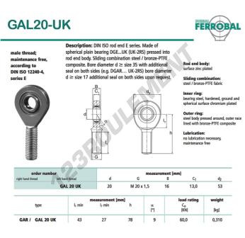 La Rotule Sa connue sous la référence GAL20-UK-DURBAL, de la marque DURBAL possède un pas de vis de et un Filetage à gauche, un diamètre intérieur de 20mm, un diamètre extérieur de 53mm et une épaisseur de 16mm.