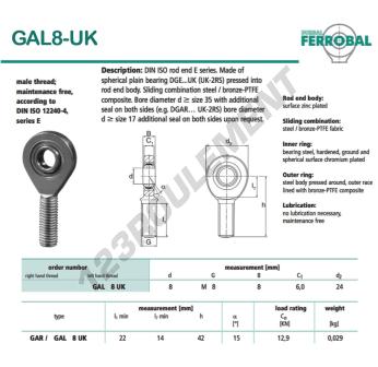 La Rotule Sa connue sous la référence GAL8-UK-DURBAL, de la marque DURBAL possède un pas de vis de et un Filetage à gauche, un diamètre intérieur de 8mm, un diamètre extérieur de 24mm et une épaisseur de 8mm.