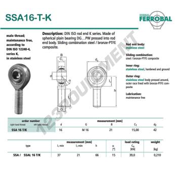 La Rotule Sa connue sous la référence SSA16-T-K-DURBAL, de la marque DURBAL possède un pas de vis de et un Filetage à droite, un diamètre intérieur de 16mm, un diamètre extérieur de 42mm et une épaisseur de 21mm.
