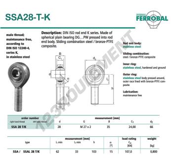 La Rotule Sa connue sous la référence SSA28-T-K-DURBAL, de la marque DURBAL possède un pas de vis de et un Filetage à droite, un diamètre intérieur de 28mm, un diamètre extérieur de 66mm et une épaisseur de 35mm.