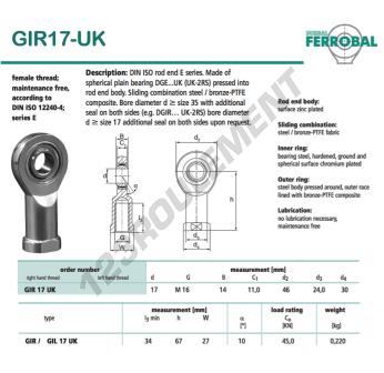 La Rotule Si connue sous la référence GIR17-UK-DURBAL, de la marque DURBAL possède un diamètre intérieur de 17mm, un diamètre extérieur de 46mm et une épaisseur de 14mm.