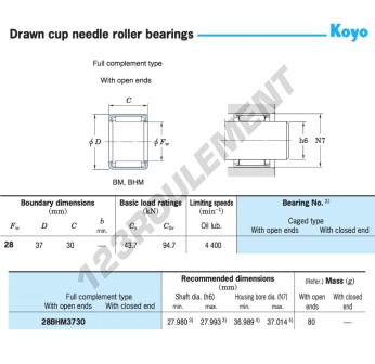 Le Roulement à Aiguilles, connu sous la référence 28BHM3730-JTEKT, de la marque JTEKT, possède un diamètre intérieur de 28mm, un diamètre extérieur de 37mm et une épaisseur de 30mm.