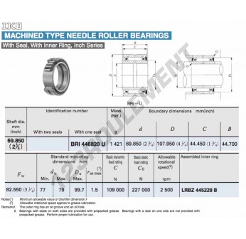 Le Roulement à Aiguilles, connu sous la référence BRI446828-U-IKO, de la marque IKO, possède un diamètre intérieur de 69.85mm, un diamètre extérieur de 107.95mm et une épaisseur de 44.45mm.