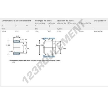 Le Roulement à Aiguilles, connu sous la référence NA4836-SKF, de la marque SKF, possède un diamètre intérieur de 180mm, un diamètre extérieur de 225mm et une épaisseur de 45mm.