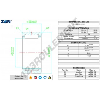 Le Roulement à Aiguilles, connu sous la référence NK14-16-ZEN, de la marque ZEN, possède un diamètre intérieur de 14mm, un diamètre extérieur de 22mm et une épaisseur de 116mm.