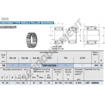 Le Roulement à Aiguilles, connu sous la référence TAFI557235-IKO, de la marque IKO, possède un diamètre intérieur de 55mm, un diamètre extérieur de 72mm et une épaisseur de 35mm.