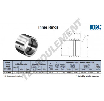 La Bague Intérieure connue sous la référence IR9648-C-RBC de la marque RBC possède un diamètre intérieur de 82.55 mm, un diamètre extérieur de 95.25 mm et une longueur de 51.054 mm.