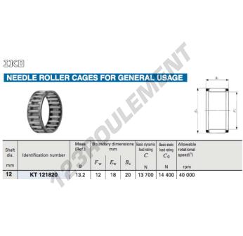 La Cage à Aiguilles, connue sous la référence KT121820C3-IKO, de la marque IKO, possède un diamètre intérieur de 12 mm, un diamètre extérieur de 18 mm et une épaisseur de 20 mm.