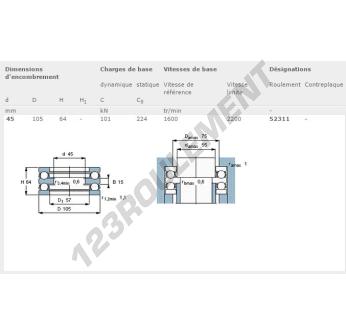 La Butée à Billes, connue sous la référence 52311-SKF, de la marque SKF, possède un diamètre intérieur de 45mm, un diamètre extérieur de 105mm et une épaisseur de 64mm.