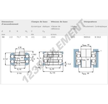 La Butée à Billes, connue sous la référence 54312-SKF, de la marque SKF, possède un diamètre intérieur de 50mm, un diamètre extérieur de 110mm et une épaisseur de 70.7mm.