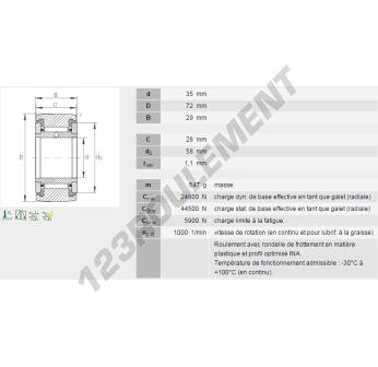 Le Galet à Billes, connu sous la référence NATR35-PP-INA, de la marque INA, possède un diamètre intérieur de 35mm, un diamètre extérieur de 72mm et une épaisseur de 29mm.