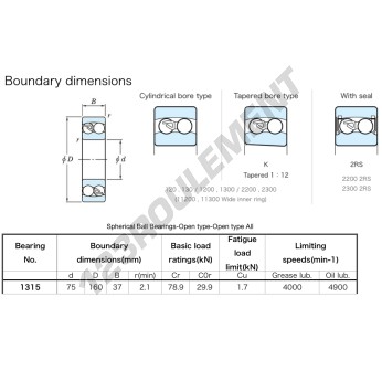 Le Roulement à Rotule Sur Billes, connu sous la référence 1315-JTEKT, de la marque JTEKT, possède un diamètre intérieur de 75mm, un diamètre extérieur de 160mm et une épaisseur de 37mm.