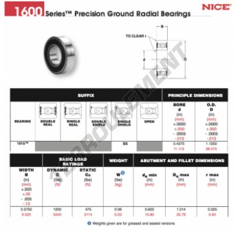 Le Roulement à Billes, connu sous la référence 1615-SS-NICE, de la marque NICE, possède un diamètre intérieur de 11.113mm, un diamètre extérieur de 28.575mm et une épaisseur de 9.525mm.