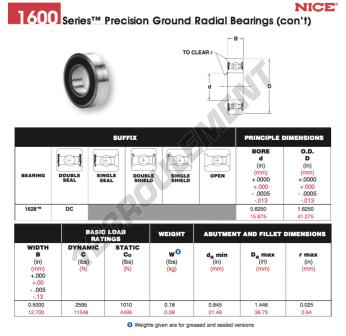Le Roulement à Billes, connu sous la référence 1628-DC-NICE, de la marque NICE, possède un diamètre intérieur de 15.875mm, un diamètre extérieur de 41.275mm et une épaisseur de 12.7mm.