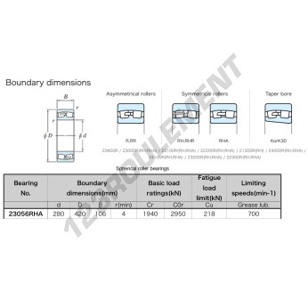 Le Roulement à Billes, connu sous la référence 23056-RHA-JTEKT, de la marque JTEKT, possède un diamètre intérieur de 280mm, un diamètre extérieur de 420mm et une épaisseur de 106mm.