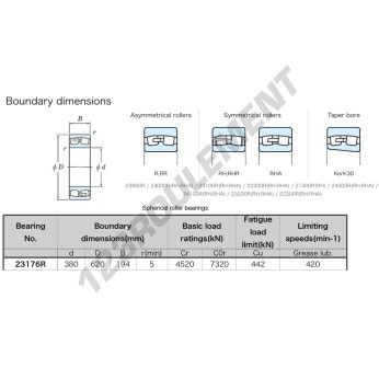 Le Roulement à Billes, connu sous la référence 23176-R-JTEKT, de la marque JTEKT, possède un diamètre intérieur de 380mm, un diamètre extérieur de 620mm et une épaisseur de 194mm.