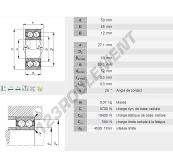 Le Roulement à Billes, connu sous la référence 3810-2RS-INA, de la marque INA, possède un diamètre intérieur de 50mm, un diamètre extérieur de 65mm et une épaisseur de 12mm.