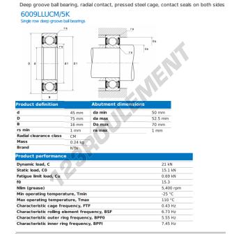 Le Roulement à Billes, connu sous la référence 6009-LLU-CM-5K-NTN, de la marque NTN, possède un diamètre intérieur de 45mm, un diamètre extérieur de 75mm et une épaisseur de 16mm.