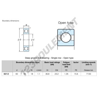 Le Roulement à Billes, connu sous la référence 6012-JTEKT, de la marque JTEKT, possède un diamètre intérieur de 60mm, un diamètre extérieur de 95mm et une épaisseur de 18mm.