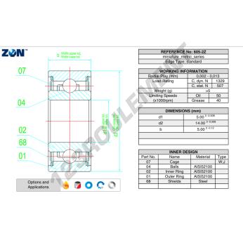 Le Roulement à Billes, connu sous la référence 605-2Z-ZEN, de la marque ZEN, possède un diamètre intérieur de 5mm, un diamètre extérieur de 14mm et une épaisseur de 5mm.